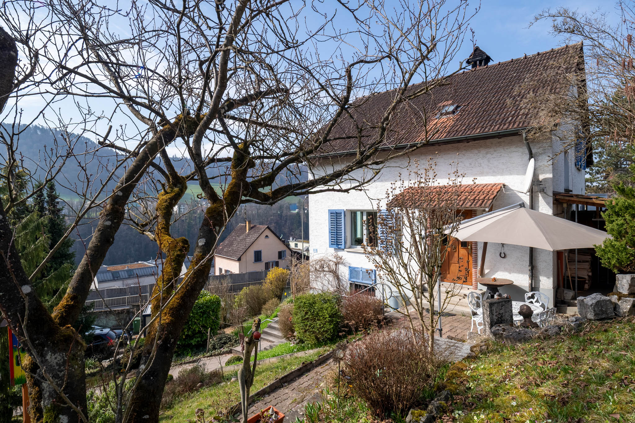 Der weitläufige Garten bietet zahlreiche Möglichkeiten zur Gestaltung. Mehrere Sitzplätze, eine gedeckte Pergola sowie grosses Potenzial für Terrassierungen machen dieses Grundstück zu einem kleinen Paradies für Hobbygärtner und Outdoorliebhaber.
