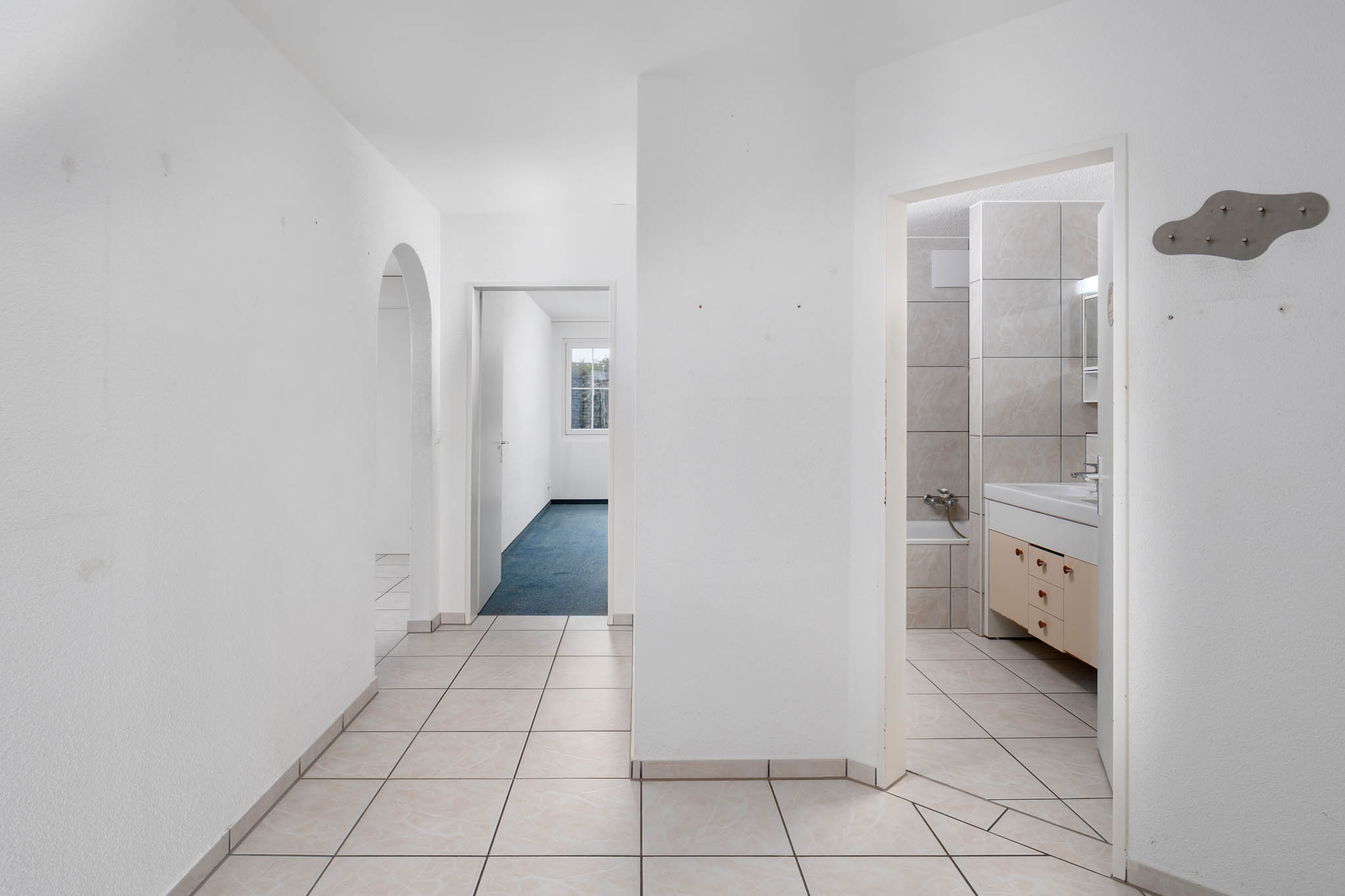 Am Eingangsbereich angekommen hat man hier genügend Platz für eine grosszügige Garderobe. Gleich links befinden sich die ersten beiden Schlafzimmer. Im grösseren Schlafzimmer hat es, wie auf den Bildern, einen kleinen Wasserschaden, der aber trocken ist. Die Wohnung müsste so oder so neu gestrichen werden, dies kann man im gleichen Zug auch frisch Streichen.