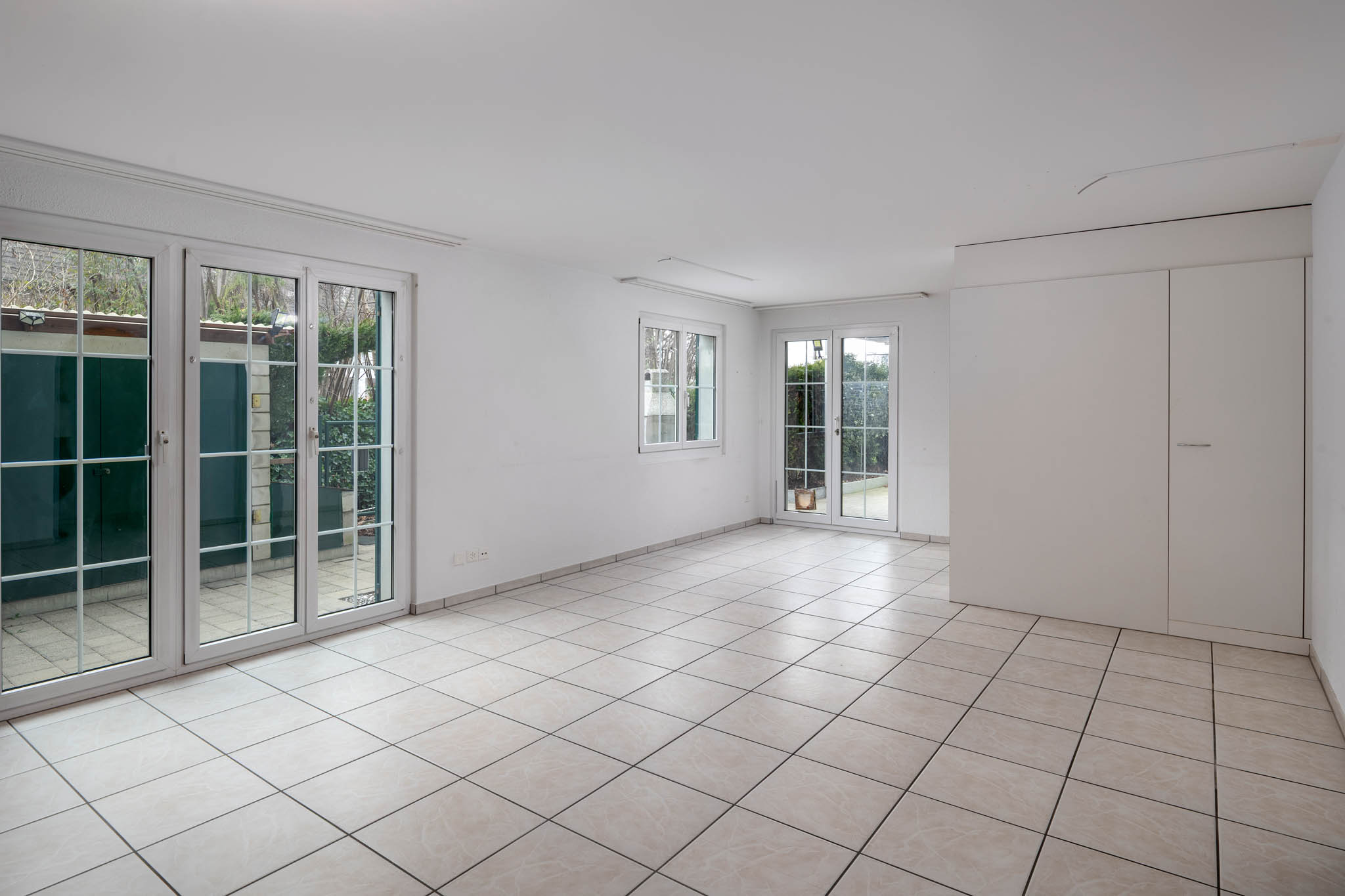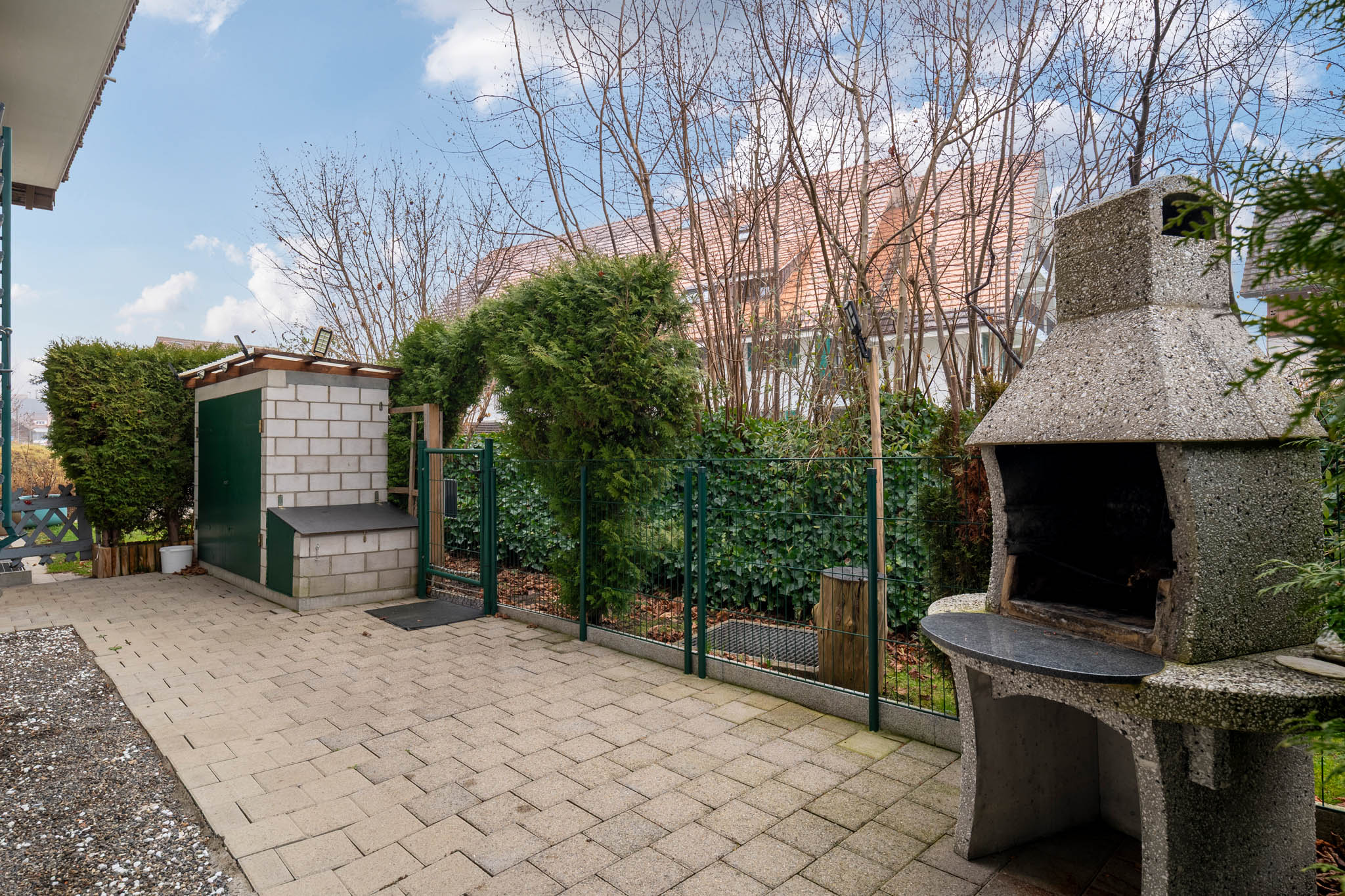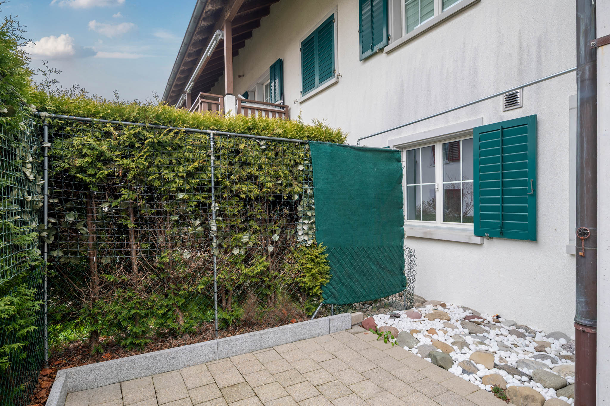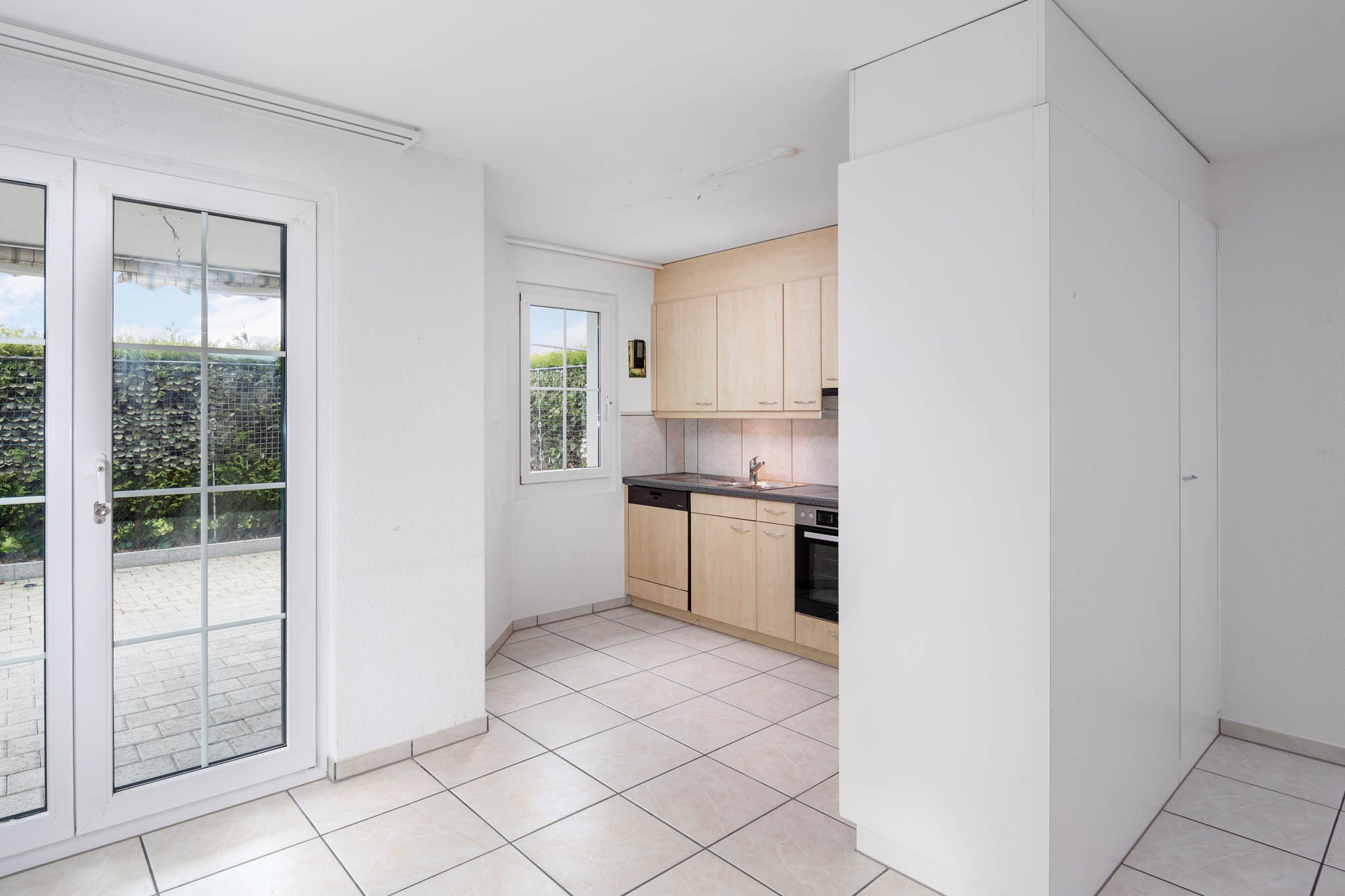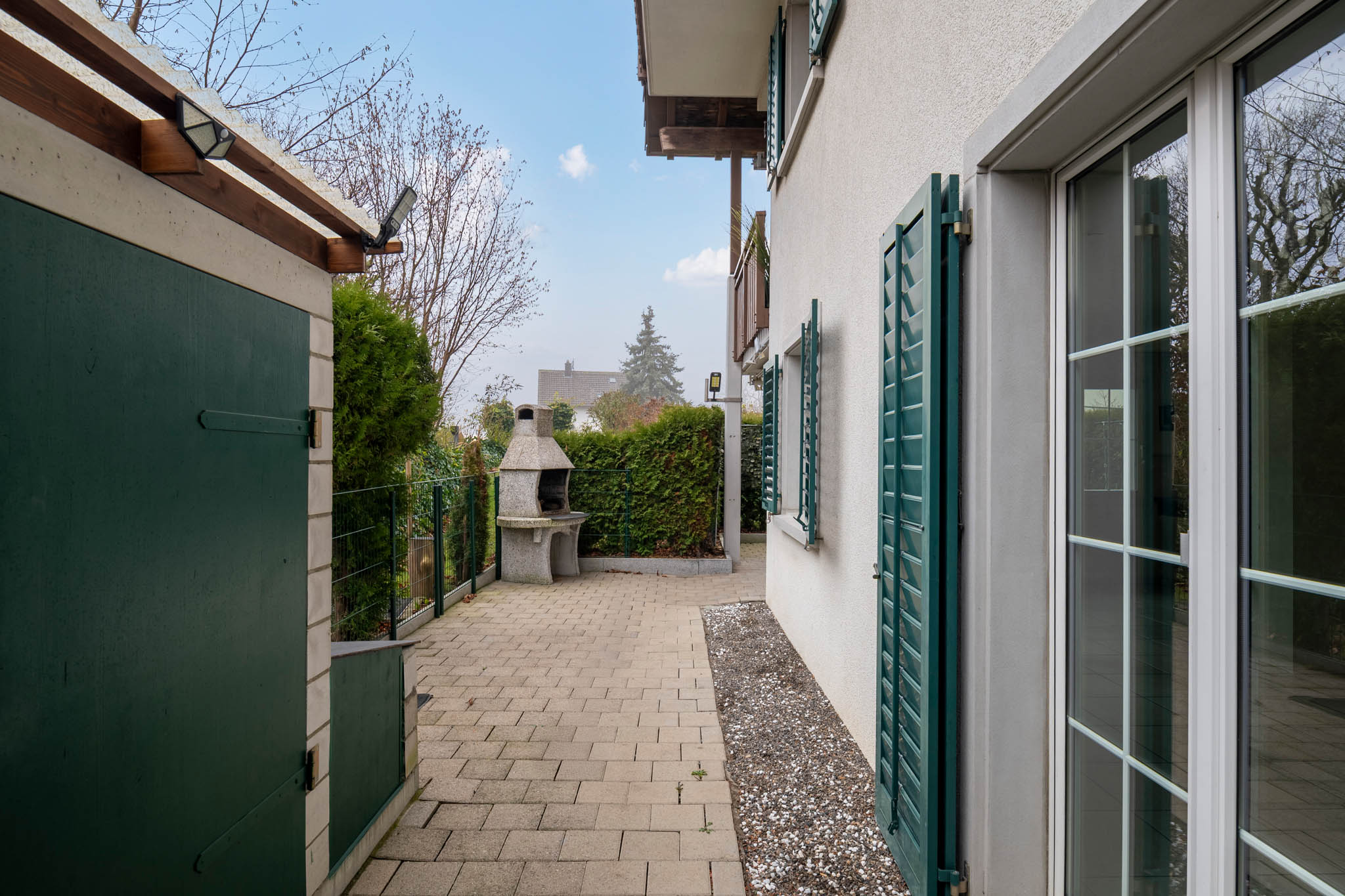 Dank den grossen Fensterfronten dringt enorm viel Licht ins Innere und Sie geniessen von jedem Raum hier einen schönen Ausblick auf den gedeckten Sitzplatz.
