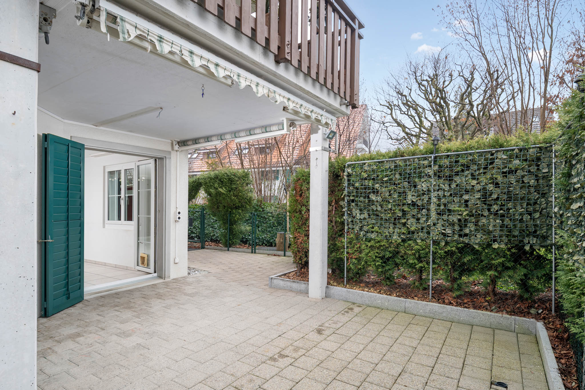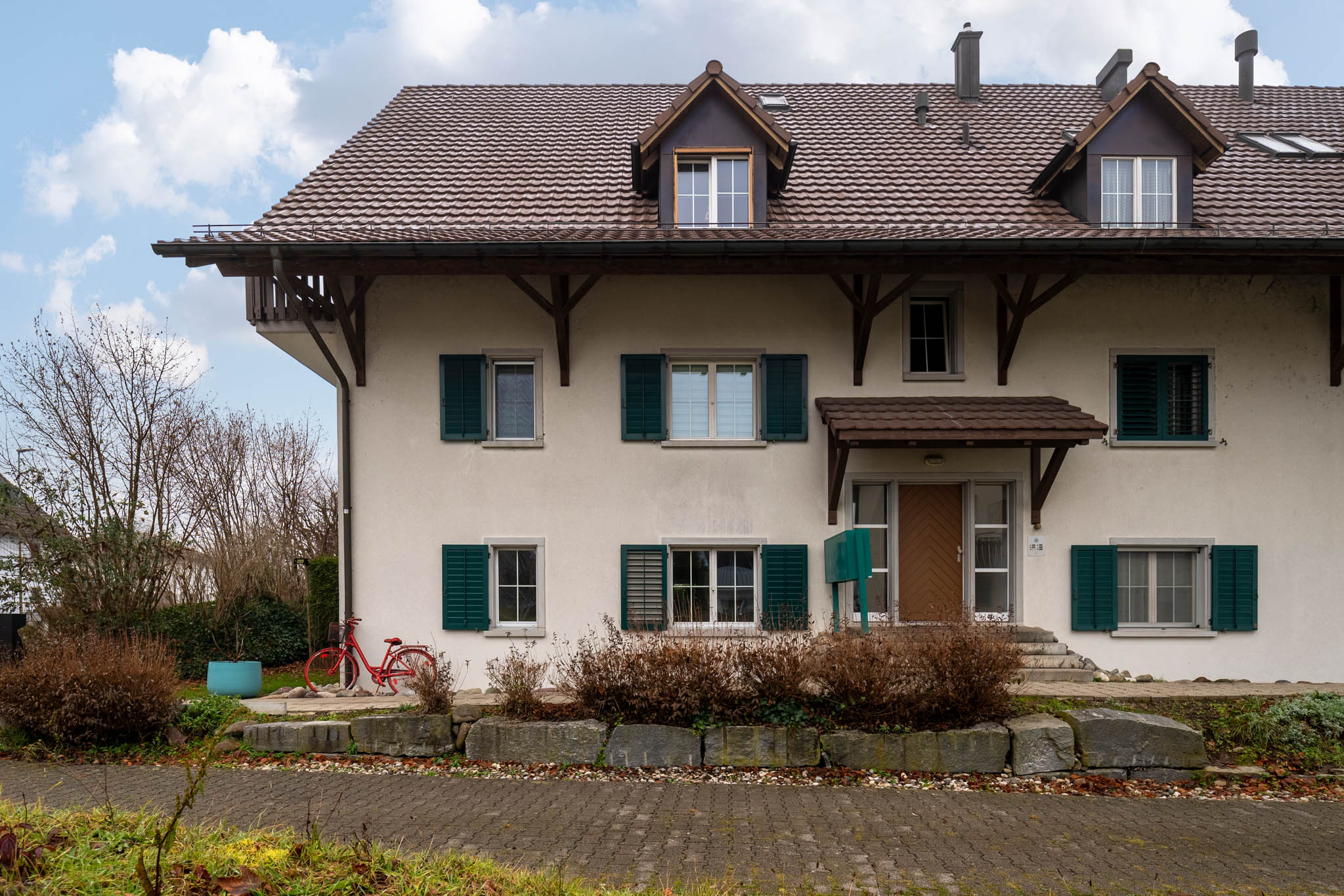 Die Erdgeschosswohnung liegt gleich zum Beginn des Mehrfamilienhauses und ist über ein paar Stufen erreichbar. Der Eingangsbereich ist offen und einladend.