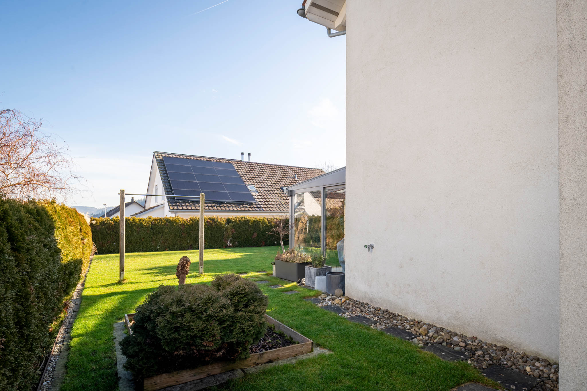 Der Wohn- und Essbereich strahlt durch das viele Licht, Behaglichkeit und Ruhe aus. Somit ist es kein Wunder, dass man sich auf Anhieb wohl in diesem Hause fühlt. Der Sitzplatz wurde verglast und beschattet, so geniessen Sie auch bei Regen das Leben draussen im Garten.